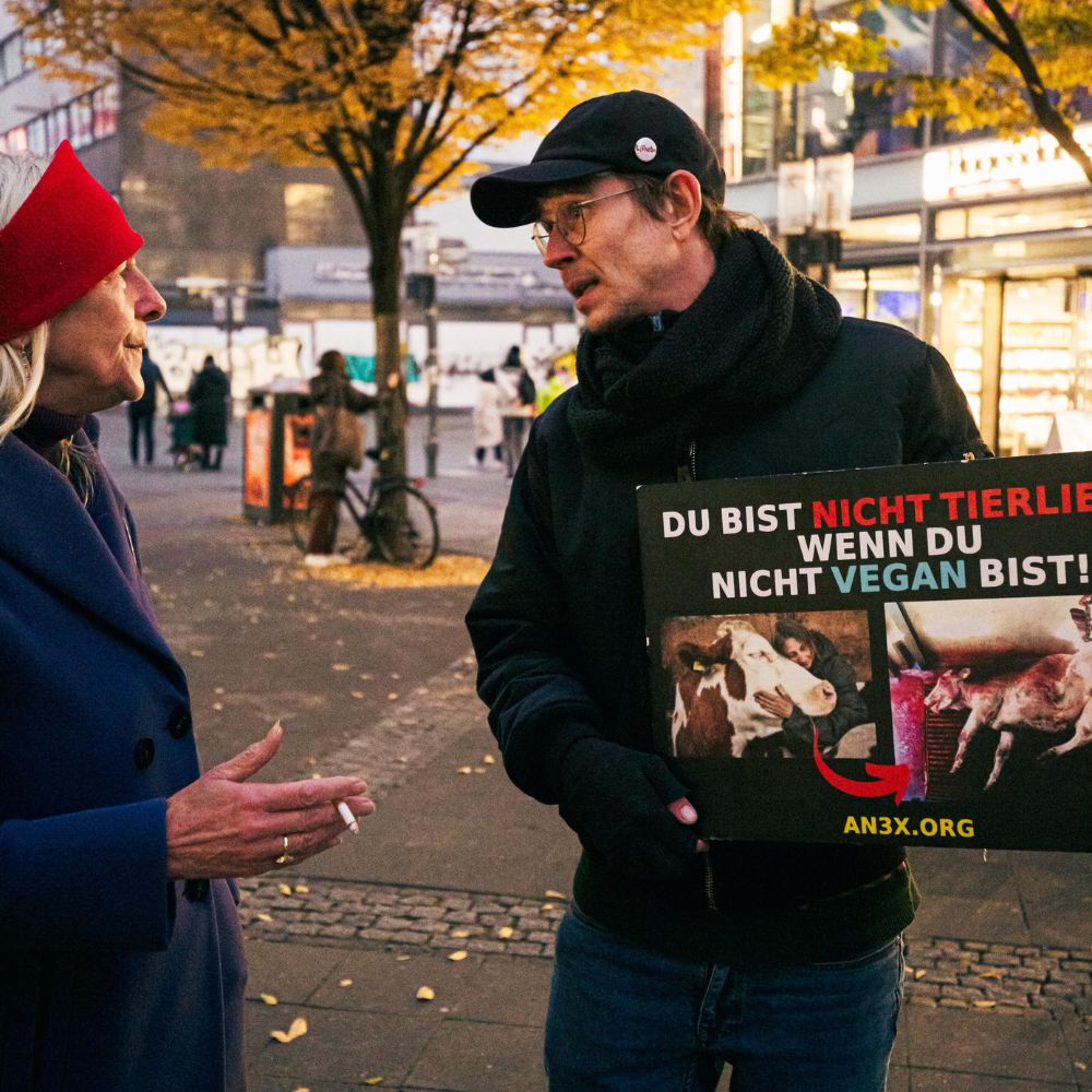 1. Die Aufklärung vor Ort: Menschen können sich von Angesicht zu Angesicht mit uns über Veganismus austauschen, individuelle Fragen und Sorgen direkt klären sowie sich hilfreiche Informationen für den Umstieg abholen.