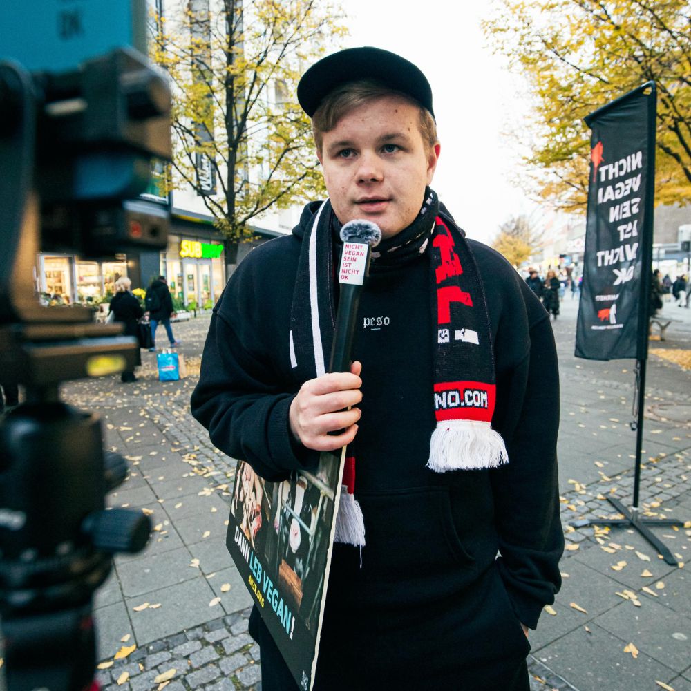 2. Die mediale Komponente: Hier liegt unser klarer Fokus, unser Motto lautet "Content First". Wir sehen mediale Dokumentation und Verbreitung, z. B. über Social Media, als den derzeit stärksten Hebel für gesellschaftliche Aufklärung und Veränderung. Konkret bedeutet das, dass wir unsere Straßengespräche filmen und u. a. über die Kanäle @diemilitanteveganerin und @derveganist teilen.