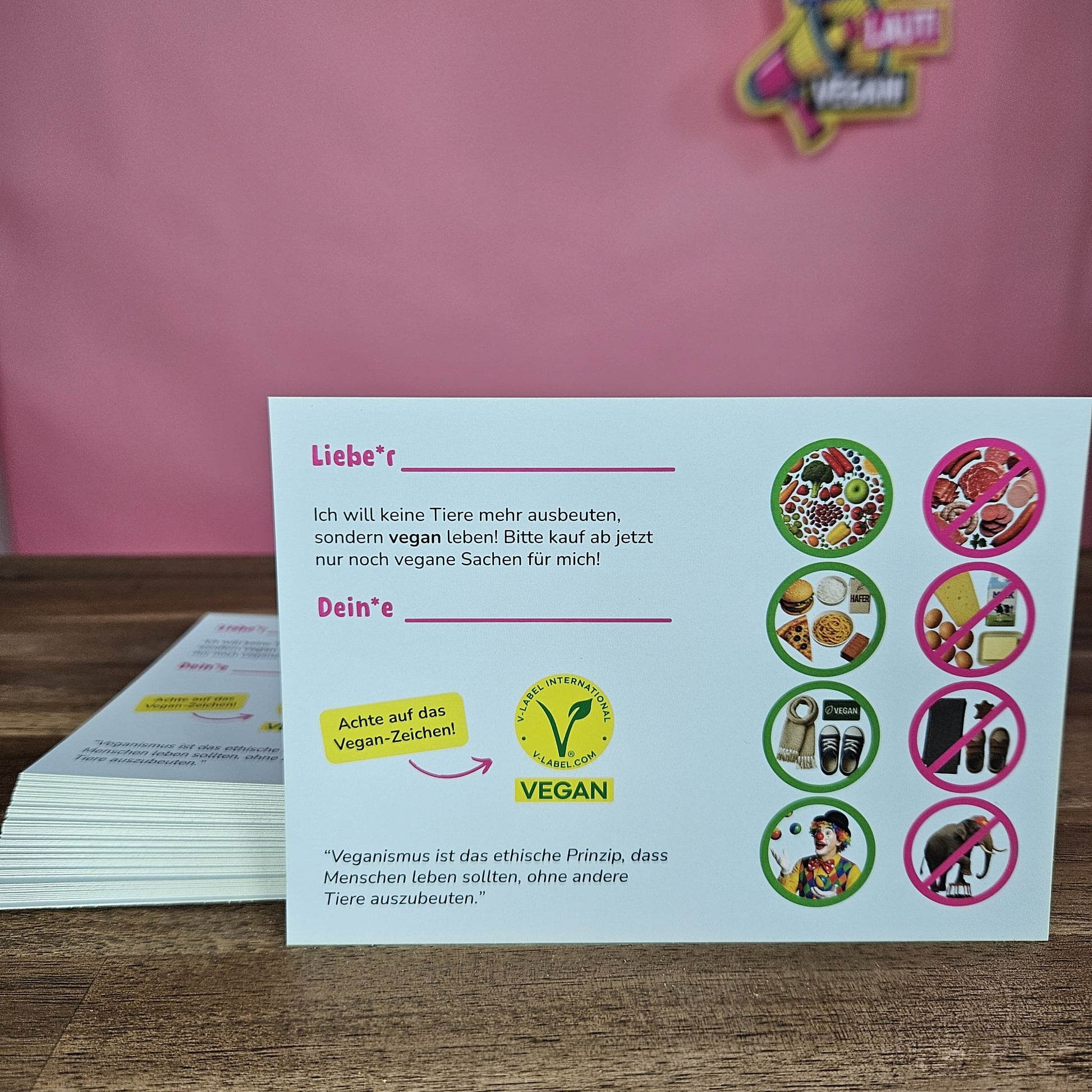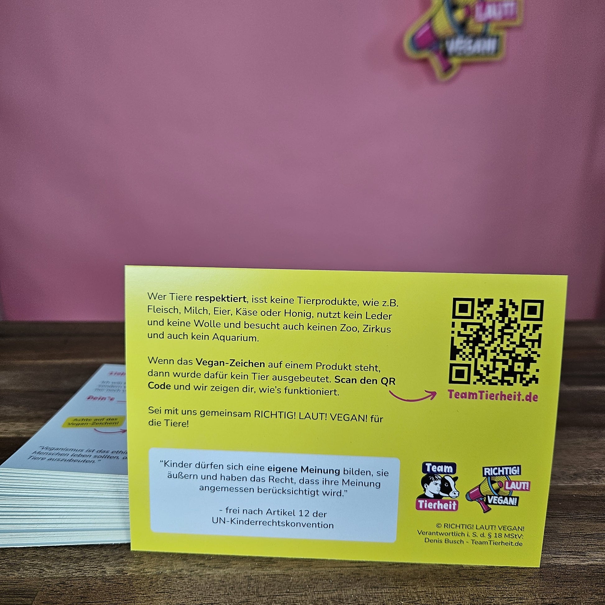"Mama, ich will ab jetzt vegan sein" – das ist der Satz, den man als Tiervertreter von Team Tierheit hören will. Hier schreibt es das Kind seinen Eltern auf und die sich hoffentlich hinter die Ohren! Der aufgedruckte Auszug aus dem Kinderrecht macht klar, dass die Eltern diesen Wunsch ernst nehmen müssen.